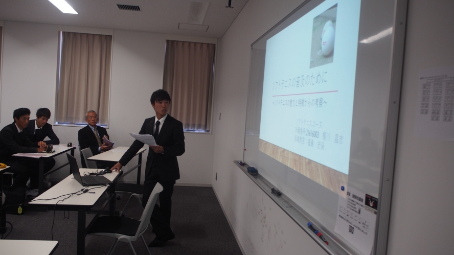ソフトテニスコースの梶川君の発表の様子です。