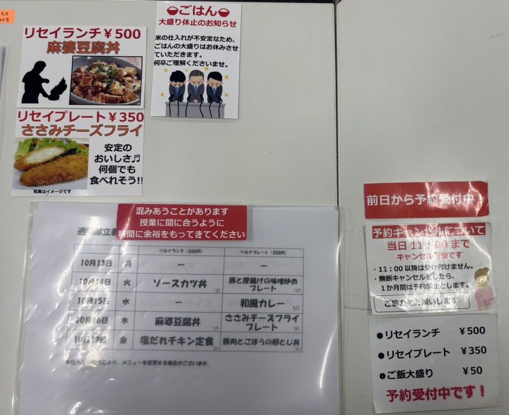 本日のメニュー ・リセイランチ 500円 麻婆豆腐丼 ・リセイプレート 350円 ささみチーズフライ