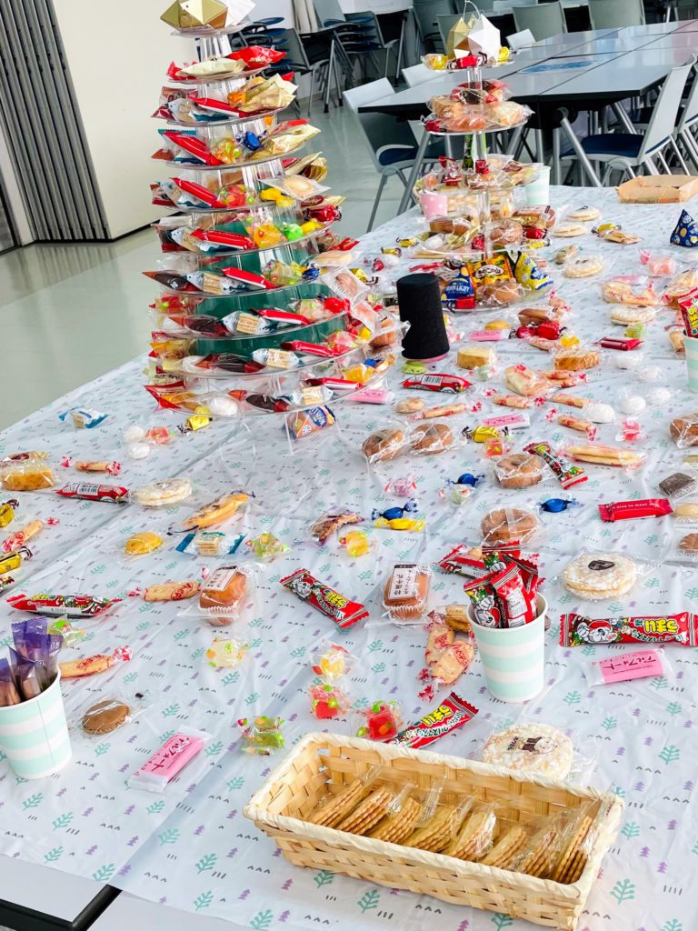 体験授業の後は、お待ちかねのランチタイム。スペシャルな「お菓子タワー」が登場!