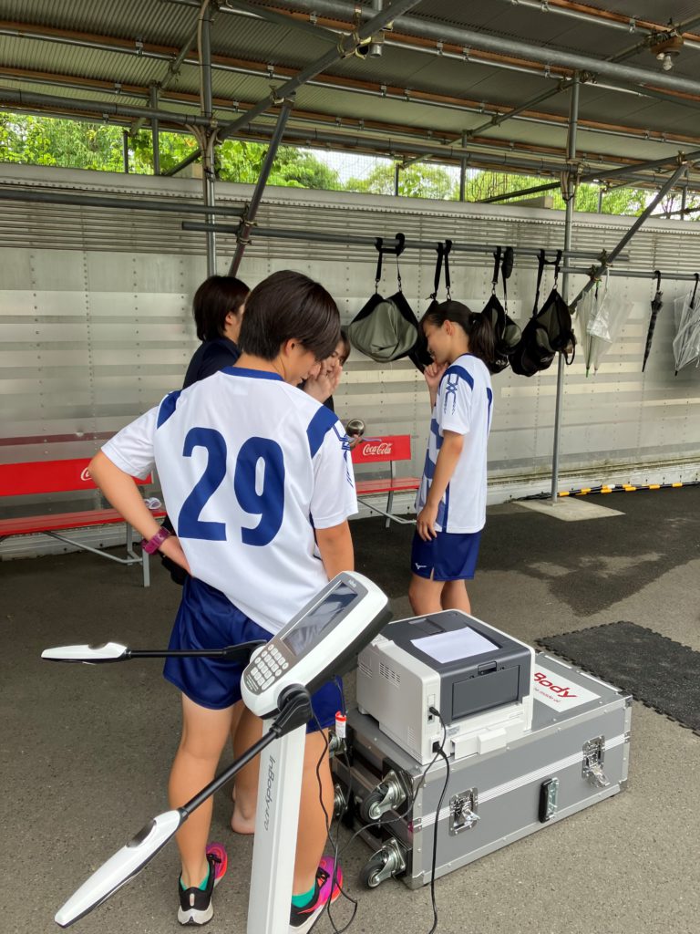 まずは体成分分析装置「In Body(インボディ)」を使い、選手それぞれの筋肉量、体脂肪量、体水分量を測定します。