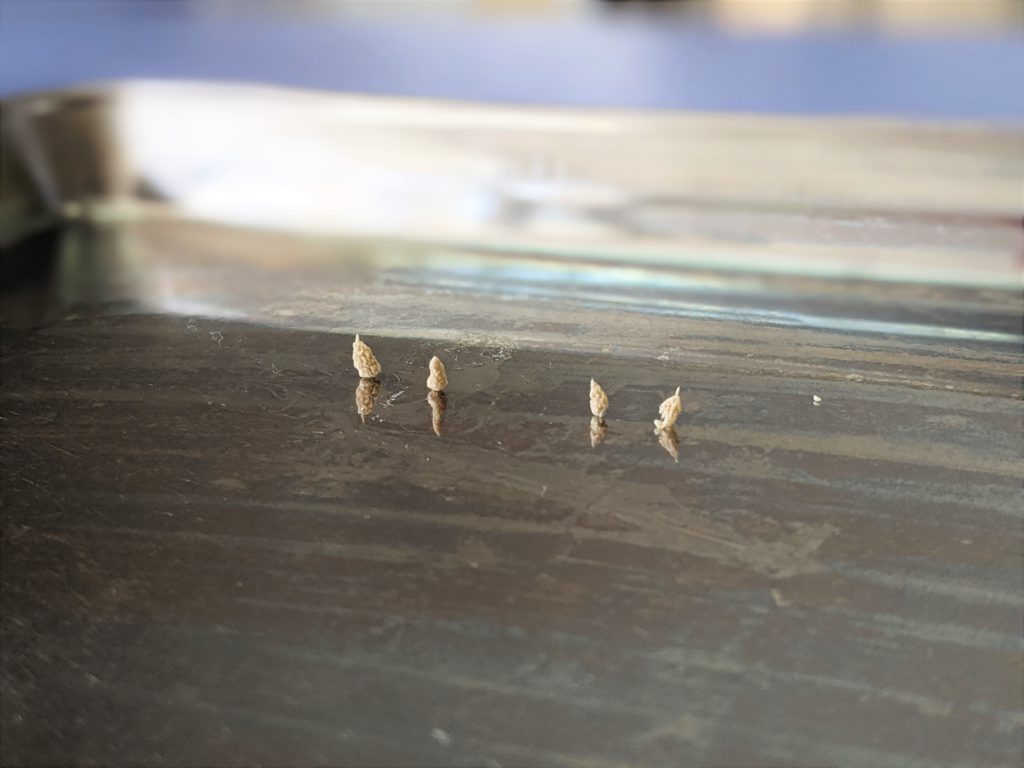 お灸は「大きさ」や「ひねる強さ」によって熱加減が変わり、刺激に強弱をつけられます。お灸の種類にもよりますが、今作っているのは「もぐさ」でできているお灸です。大きさは、お米の粒ほど。左が米粒大(べいりゅうだい)、右が半米粒大(はんべいりゅうだい)の大きさになります。円すいのきれいなものが理想的です。
