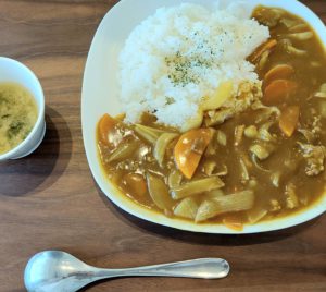 取材後、箕面キャンパスの食堂で念願のランチをいただきました。定番のカレー、野菜たっぷりで噂通りのおいしさでした。