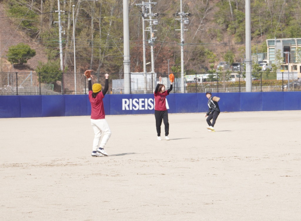 写真は、難しいフライを見事キャッチした水谷先生を「ウェーイ!」とほめたたえる日開先生&加藤先生。チームワークも抜群ですね。