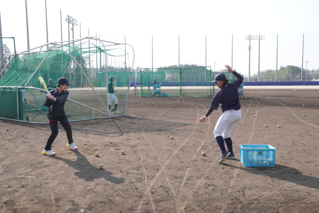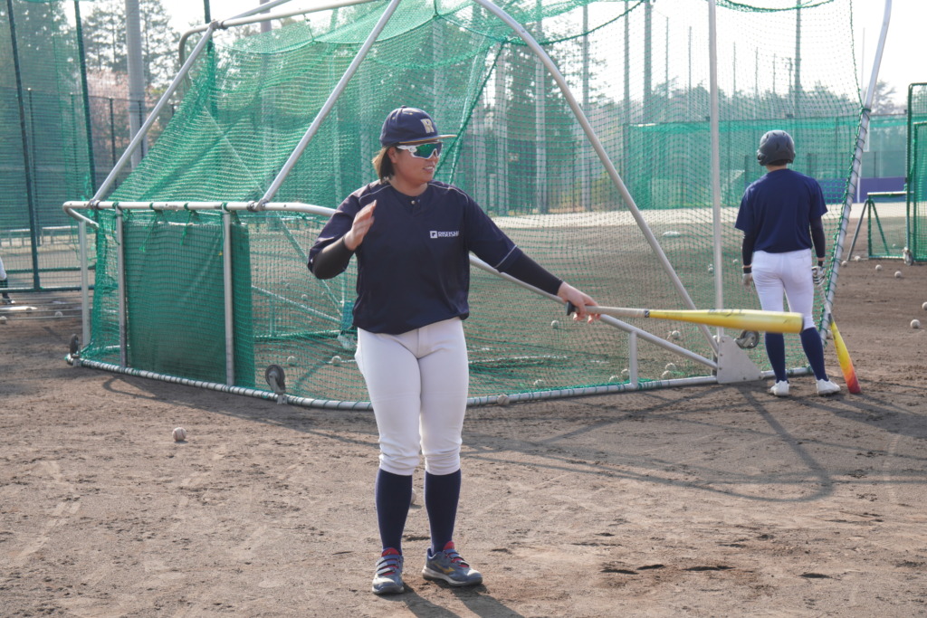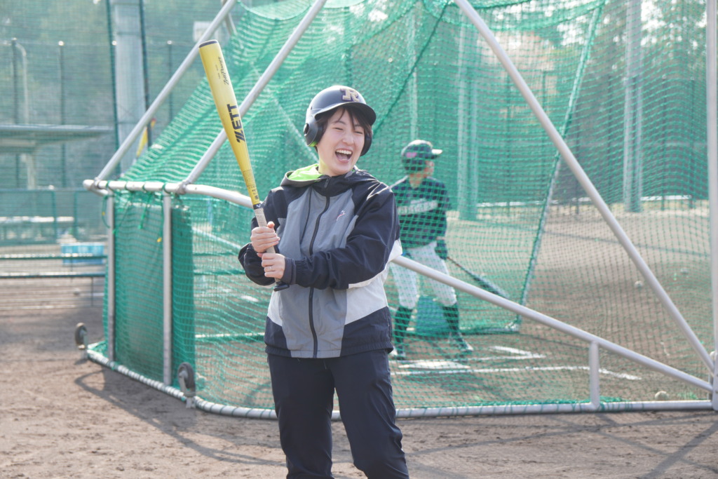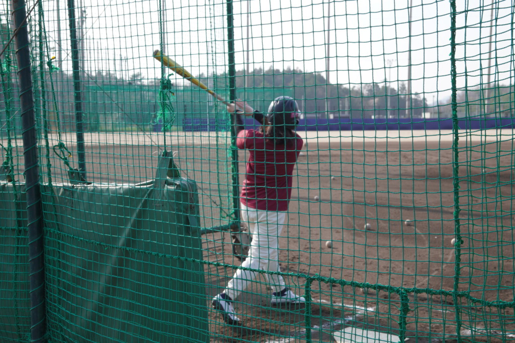 弓埜先生が、バッティングを見せてくださいました。中学から社会人まで、3度の日本一を経験。名門「阪神タイガースWomen」で活躍していた弓埜先生。