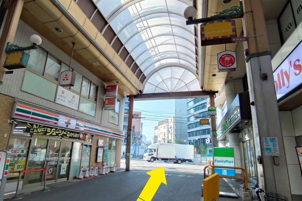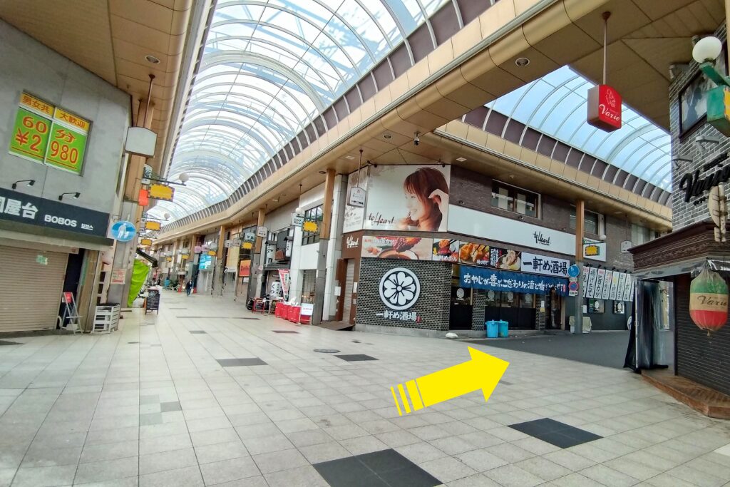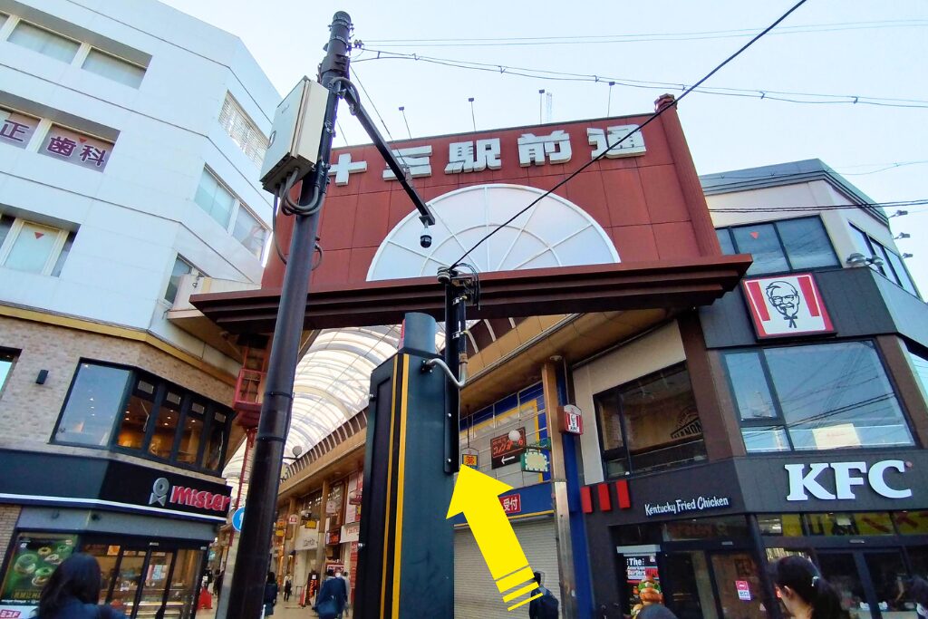 改札を出た後は、ミスタードーナツとケンタッキーが向かい合う商店街を進みます。