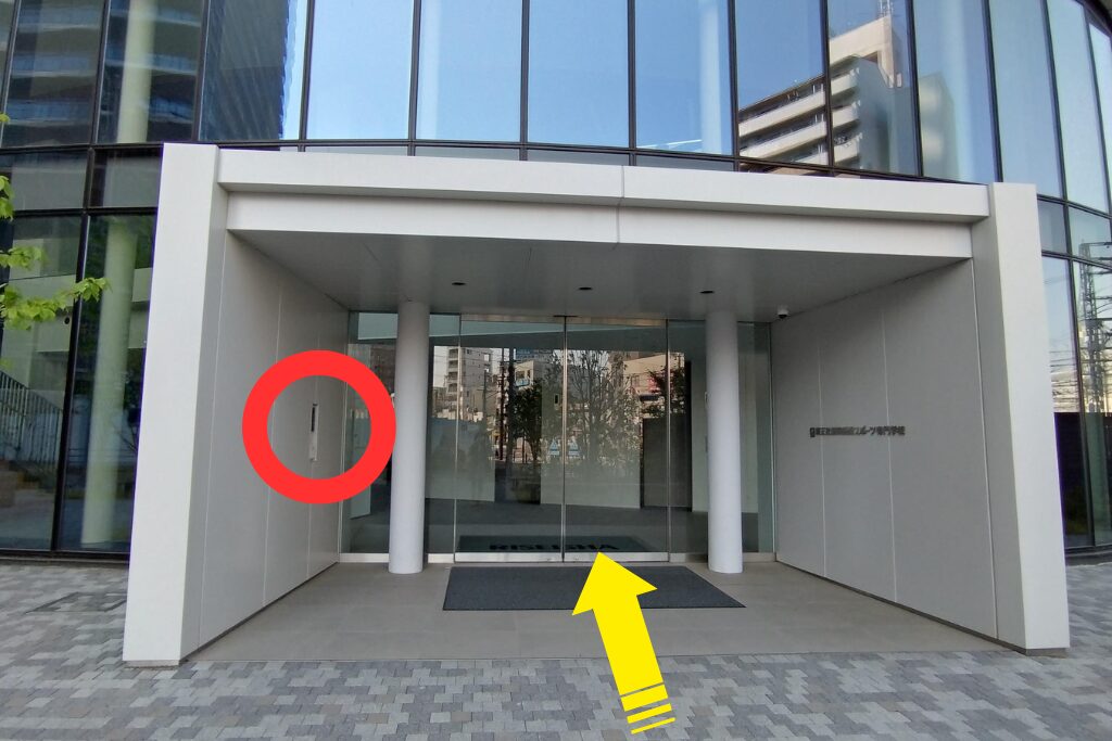 オープンキャンパスの日は、入口のドア前に立つと自動で開きます。通常は閉まっていますので、インターホン(写真の赤丸のところ)を押してご用件をお伝えください。