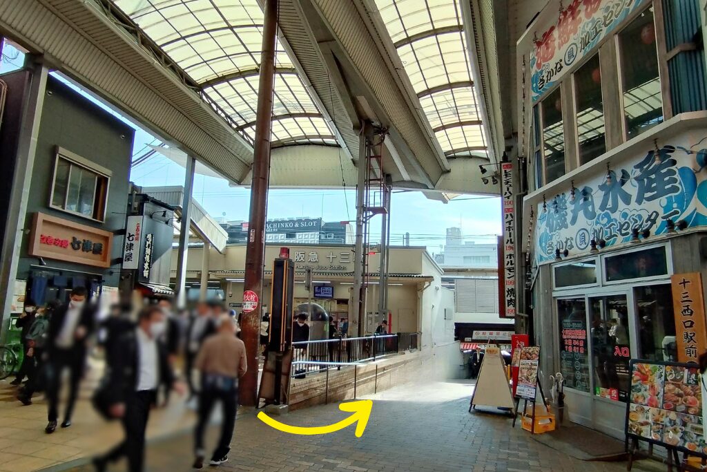 そして、もし「十三」駅で間違えて、西口改札から出てしまった時も大丈夫です。改札を出て左に曲がり、トンネルをくぐればすぐ東口に出ることができますよ。
