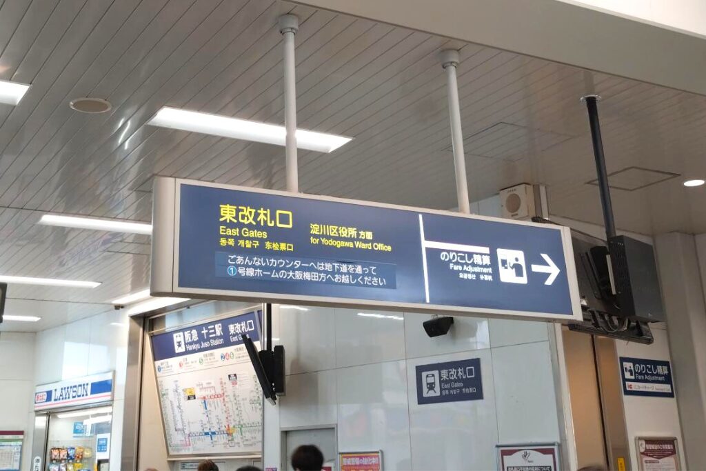 「十三」駅に到着したら、新館へ行く場合は東口の改札へ向かいます。