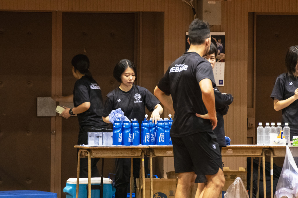 練習の前後は、選手の体重管理や、疲労度と痛みの数値を選手から聞き取り、コーチに報告しています。また、ドリンク準備やモップ掛けといったフロア管理もします。