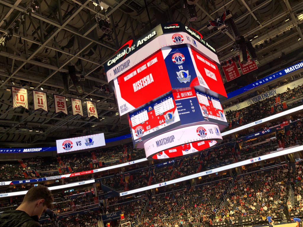 バスケットボールコースは、コロナが感染拡大する前まで、本場アメリカで例年海外研修を行っていました。これはNBAを観戦をした時に、西田先生が撮られた1枚だそうです。皆さん、よーーく見てください。オーロラビジョンに RISEISHA の文字。「WASHINGTON WIZARDS WELCOME RISEISHA」。これはテンション上がりますね!ワシントン・ウィザーズは、八村塁選手が所属するチーム。「また、連れてってやりたいですよ」と悔しそうな表情を見せる淺村先生でした。