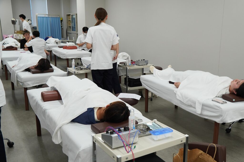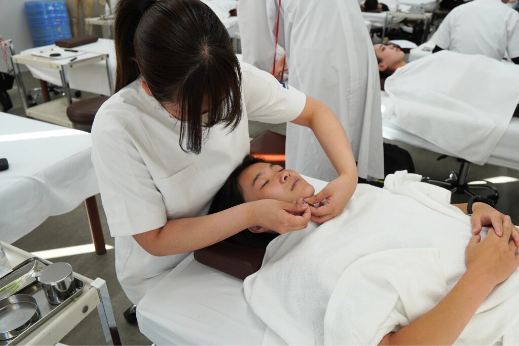本校の鍼灸学科では、顔面部の美容を目的とした鍼灸をはじめ、栄養学や皮膚解剖学などを学ぶ「トータル美容専攻」を設けています。第二部では「トータル美容専攻」の学生から施術を受けていきます。学生のほかに、職員も数名、体験参加しました。