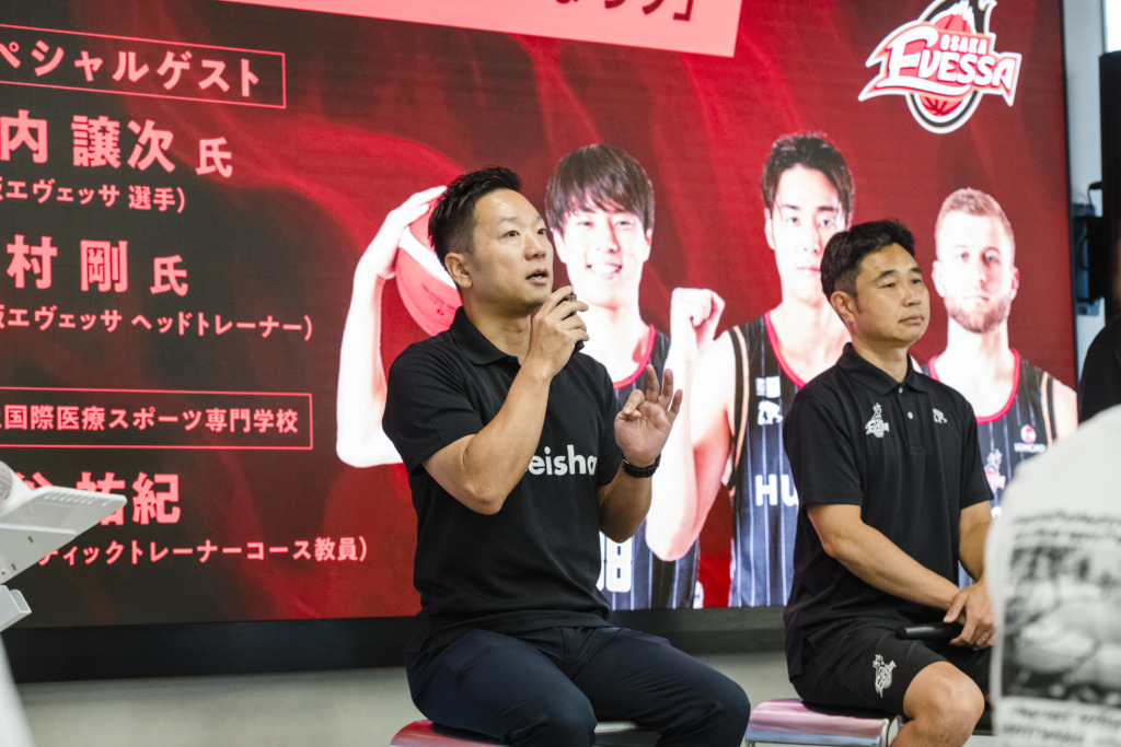 スペシャルオープンキャンパスの特別ゲストは、大阪エヴェッサの竹内譲次選手、西村剛ヘッドトレーナー。本校アスレティックトレーナーコース教員・部谷祐紀と3名でトークショーを行いました。