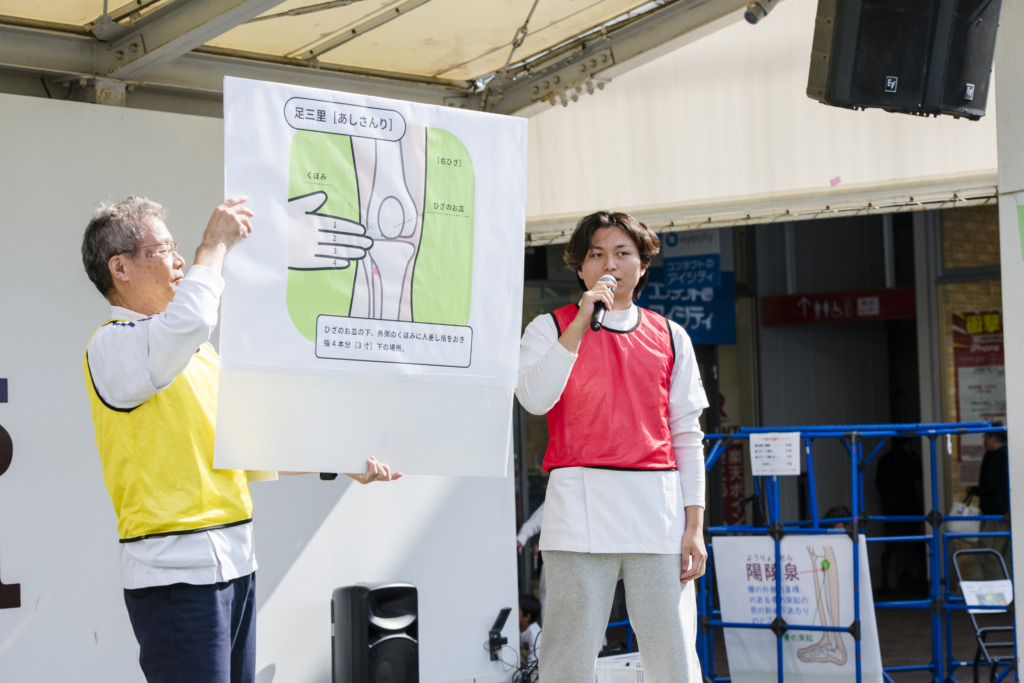首こりに効くツボなど、パネルを使って説明する学生の声に、お買い物中の方も足を止め、ツボをおさえていました。