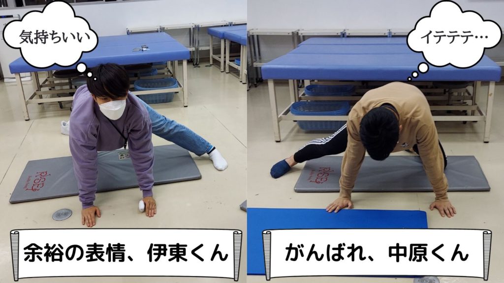 太もも内側のストレッチでは、苦悩の表情でがんばる中原くんと余裕の笑みを浮かべて行う伊東くんの差があまりにも……(私の脳内に映ったふたりを写真で再現してみました)。