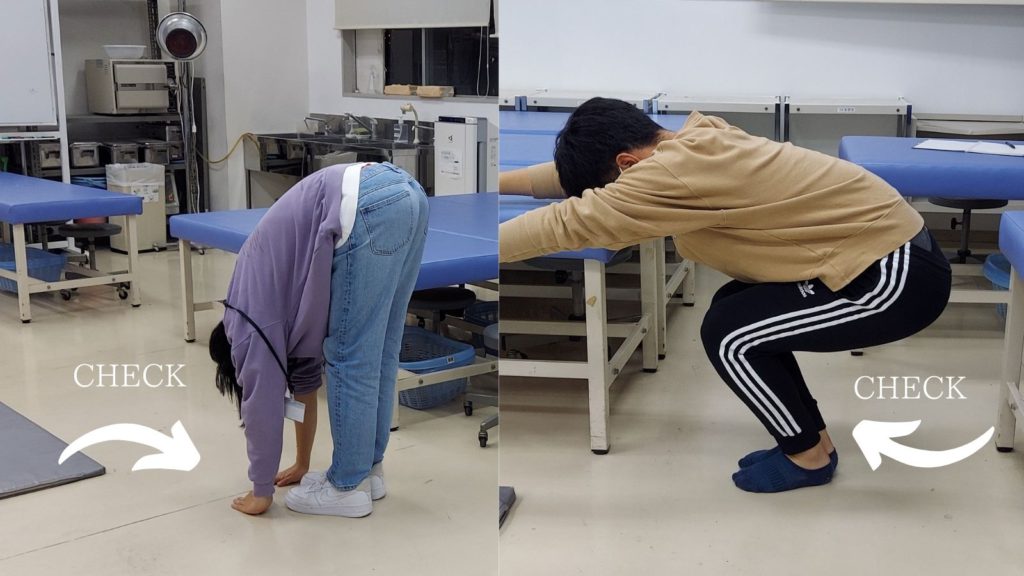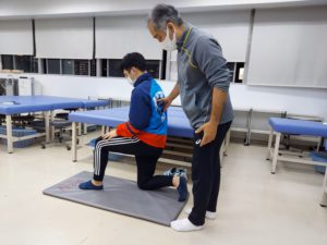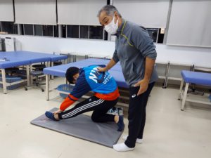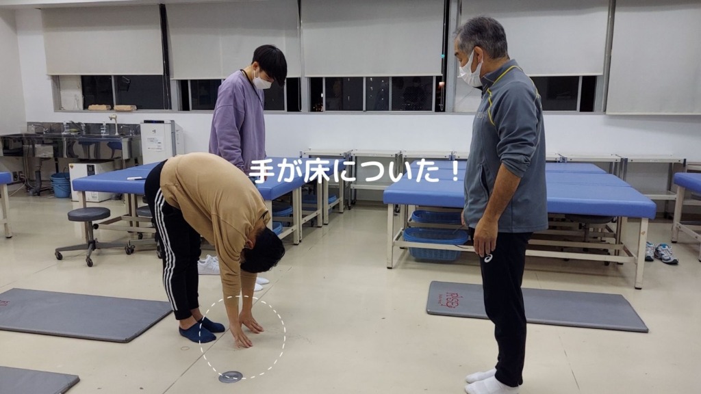 写真は脊椎の柔らかさを確かめるべく床に手をつけている伊東くん(柔らかっ!)と、足関節をチェックしている中原くんです。