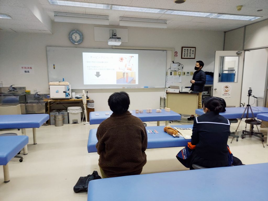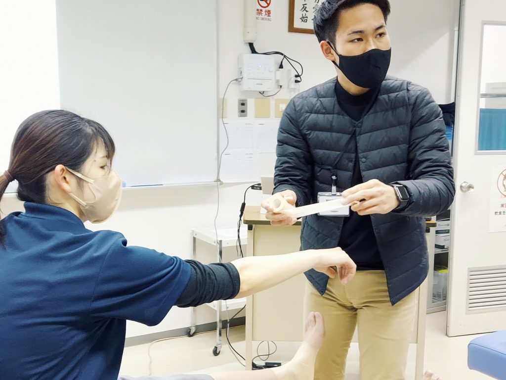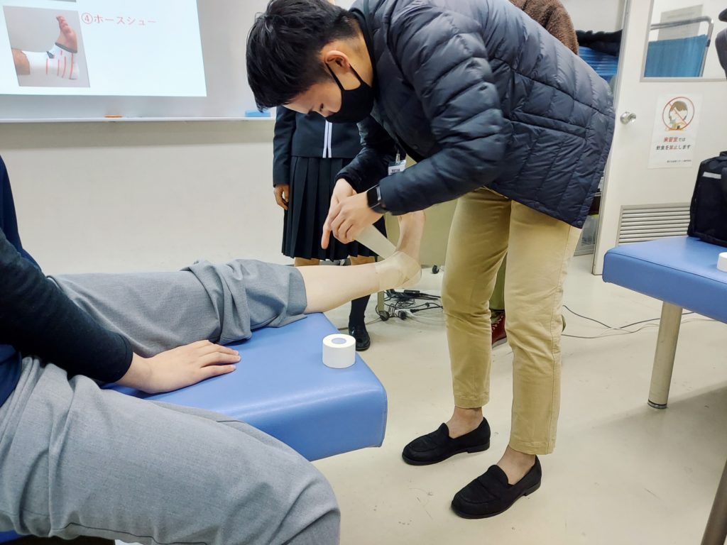 「まずはこんな感じで巻いていきます」とテーピングを手にするや、目にもとまらぬ早さ(←広報Mの体感です)でくるくるくるくるくる~~~っと巻きだす脇田先生。テーピングの持ち方など、コツもしっかりと教わります。