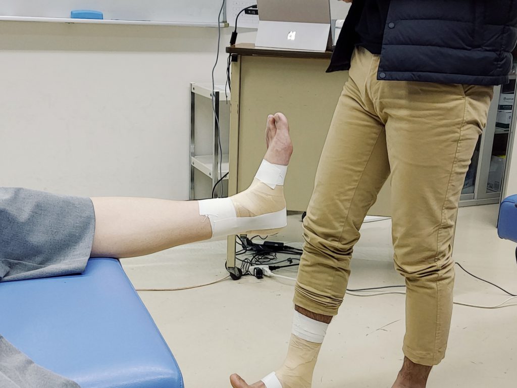 とにもかくにも実践あるのみ。ということで、今回はバスケットボール、バレーボール、サッカーなどの球技で起きやすい「足関節捻挫」を想定したテーピングを教わりました。