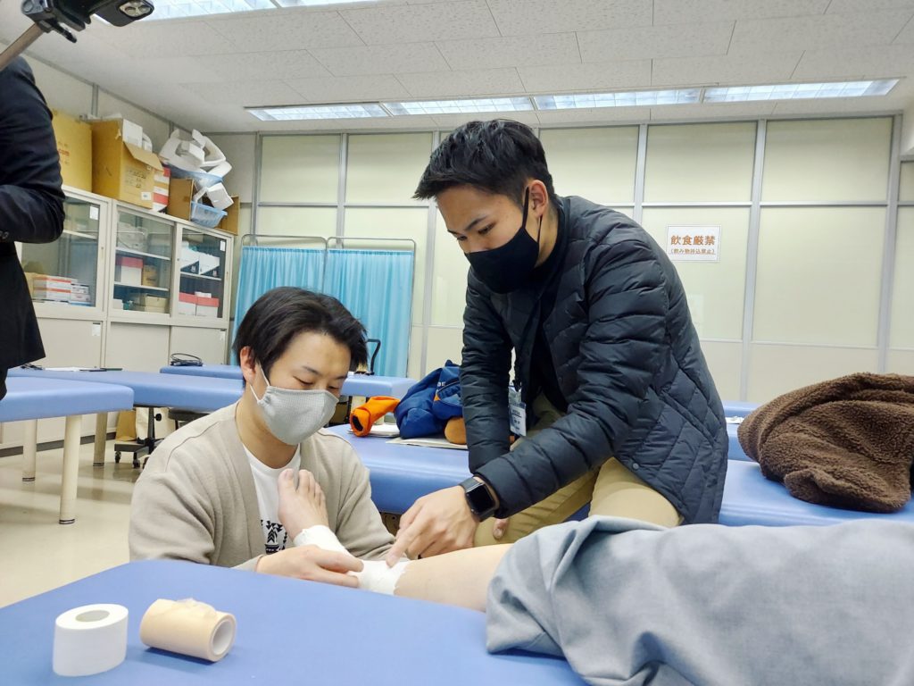 基本の巻き方を教わった後は、応用編として伸縮するタイプのテープを使って再度チャレンジ。基本編のおさらいをしながらもう一度、巻いていきます。