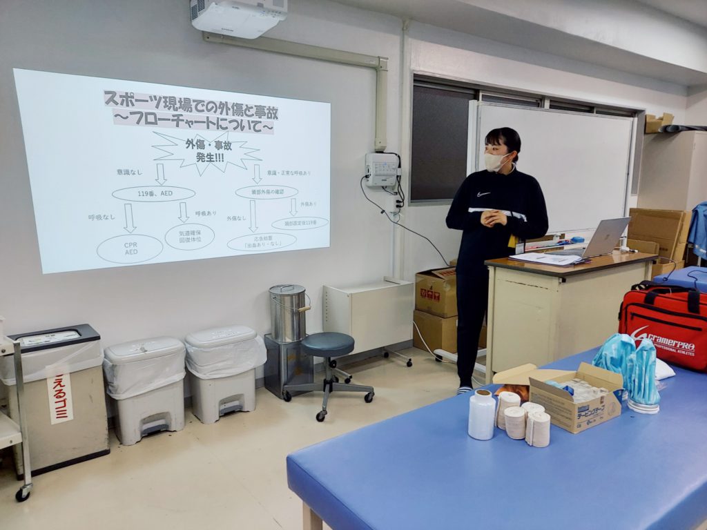 初めは座学から。スポーツの現場での外傷と事故の発生状況や、処置を行う際のフローチャートをレクチャーいただきました(個人的には、フローチャートで処置の流れを説明するなかで、「学校や試合会場でAEDがどこにあるか、普段から確認しておくといいですよ」という先生のお話に膝を打ちました)。