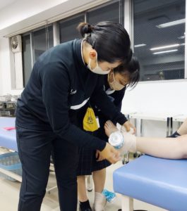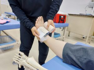 作ったアイシングを患部に当て、バンテージで巻く練習もしました。