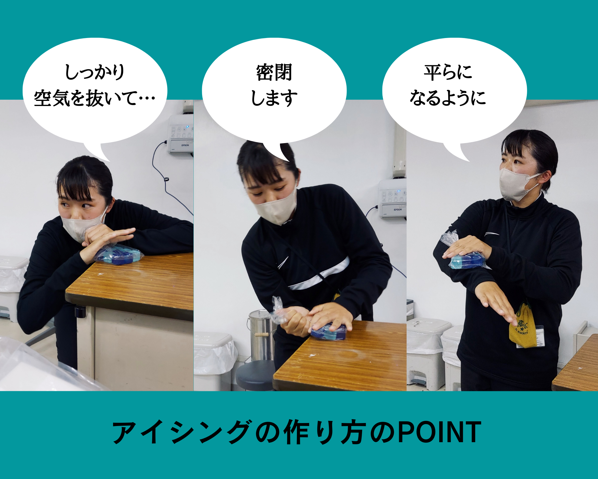 まずは氷の詰め方、空気の抜き方、袋の閉じ方などをデモンストレーション。
