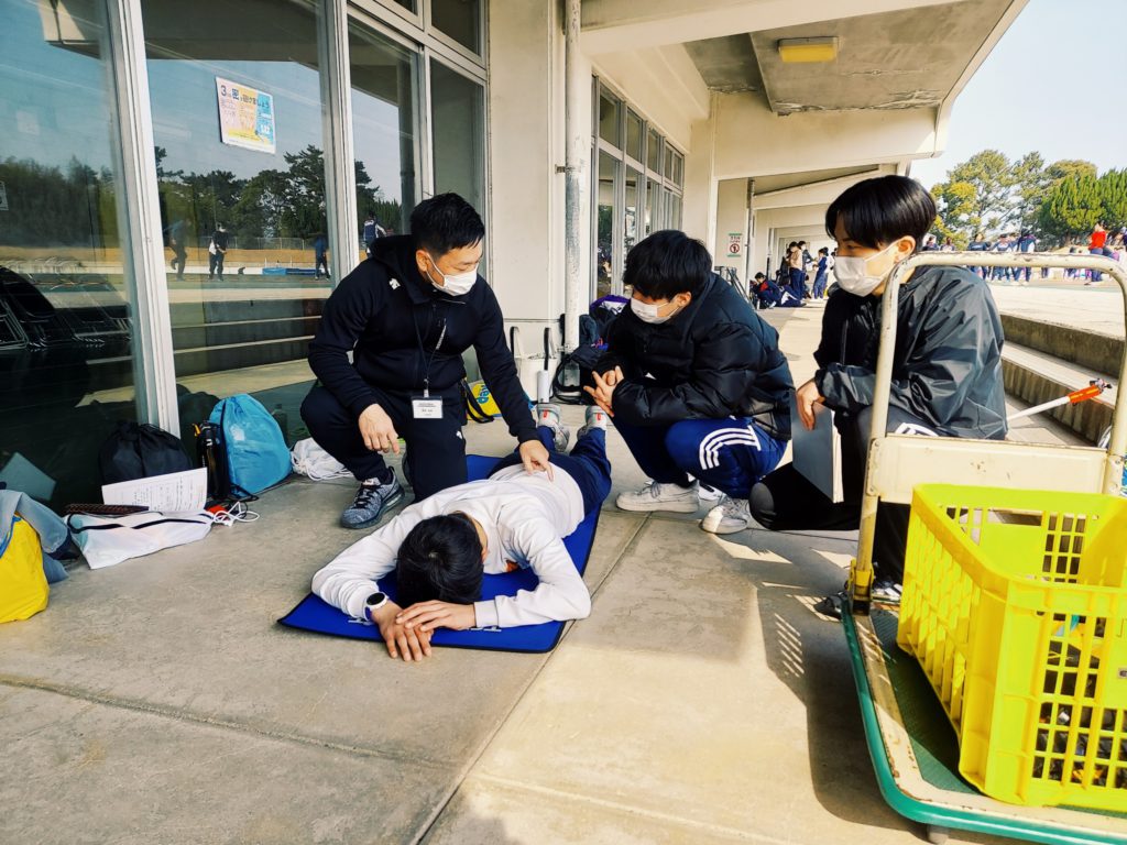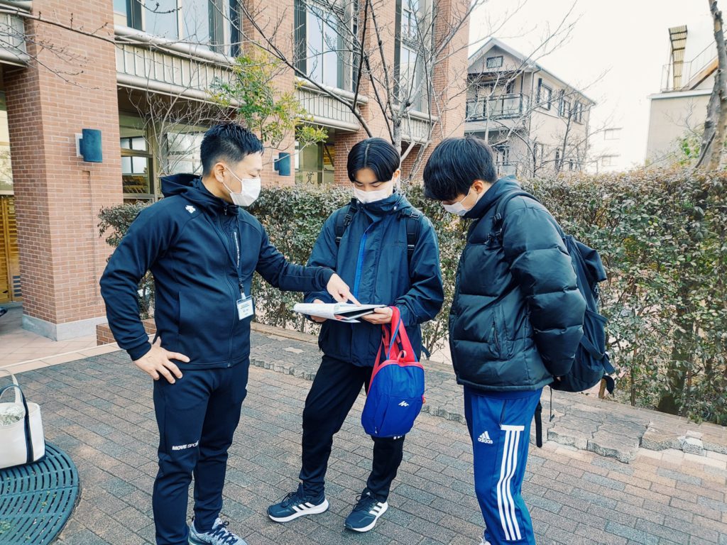 取材が行われたのは3月。部谷先生が担当するアスレティックトレーナー実習を見学させてもらうため、履正社高校をたずねました。この日は、福原碧音さん(鍼灸AT)と重松皇汰さん(AT)が陸上部の選手をサポート。あと1名学生がいるそうなのですが、他現場の合宿サポートに参加のため欠席でした(お会いできず残念)。