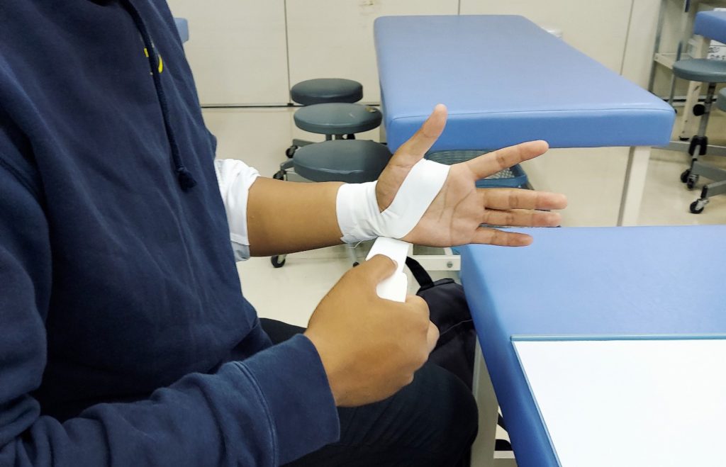 「手首を手のひら側に曲げると痛い、という人に、どうテーピングを巻いていきますか?」。