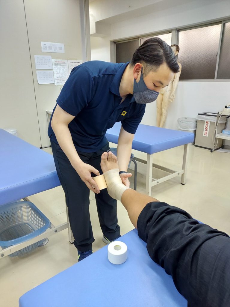 まずは足首へ、基本のデモンストレーション。アンダーラップ、1枚だけアンカーテープ、伸縮性のあるテープでスターアップ、フィギュアエイトを行います。