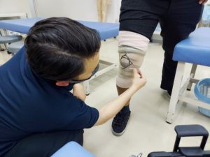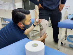 今度は膝へのテーピングです。本来は膝も、工程がたくさんありますがごく簡単に。