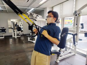 TRX®はさまざまなツールがありますが、本校ではTRX®サスペンショントレーニングを使用します。こうやって、腕をひいたりします。