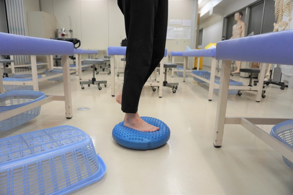 ↑足首の機能を高めるために、バランスボードにのって片脚立ち。競技特性に合わせ、この状態からチューブを使ったり、キャッチボールをしたりも。