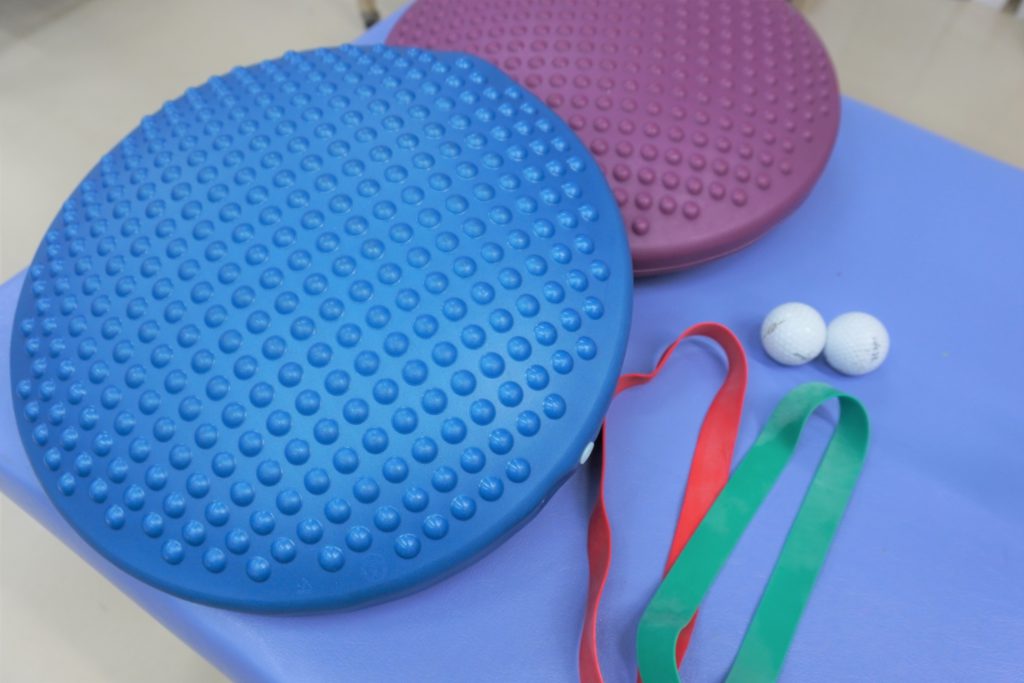 中には神経筋機能の改善をはかるため、身体の位置、スピードを伝えてくれる「固有感覚」を養うバランスボードのエクササイズも(ねんざした足のほうをしっかりやることが大切だそうです)。