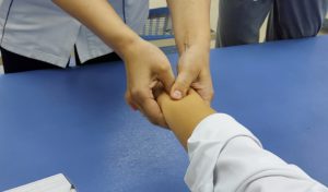 まずは男性アスリートに多いスポーツ疾患であるオスグッド・シュラッター病について学びました。オスグッドの治療、予防には筋肉の柔軟性をあげることが大切で、鍼灸ケアでは、筋肉に関係するツボを直接刺激することでアプローチできるのだそうです。