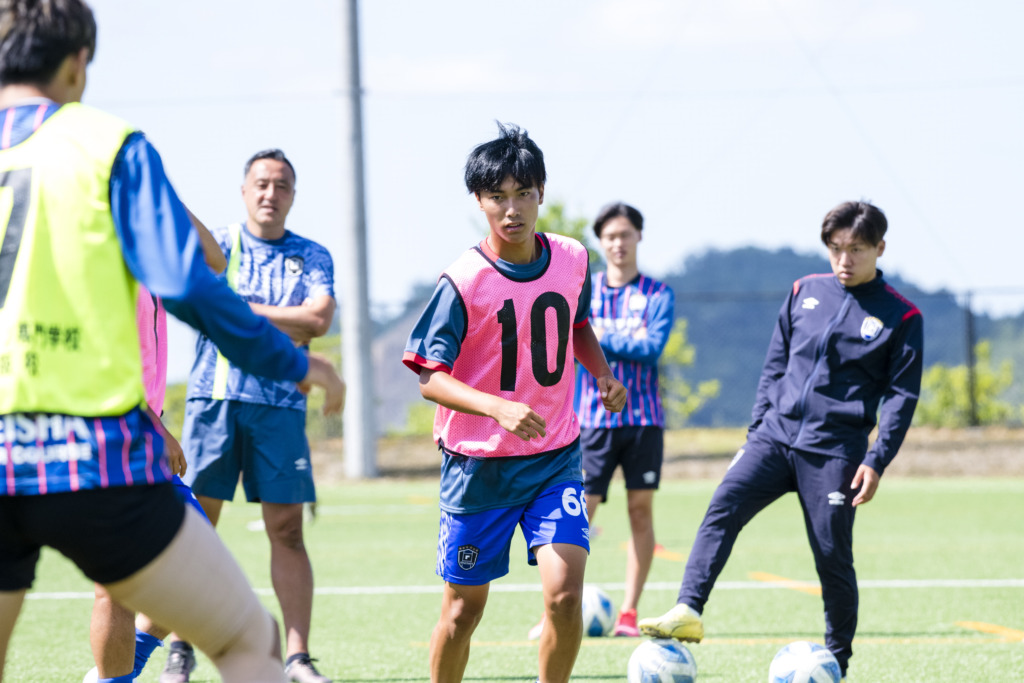 通常練習に参加してもらいます。ウォーミングアップから始まり、ボールキープやシュート練習を行います。最後にゲームを行い、クールダウンをして終了です。各メニューの概要やプレーポイントの説明は在校生がサポートしますので、何でも質問してください。
