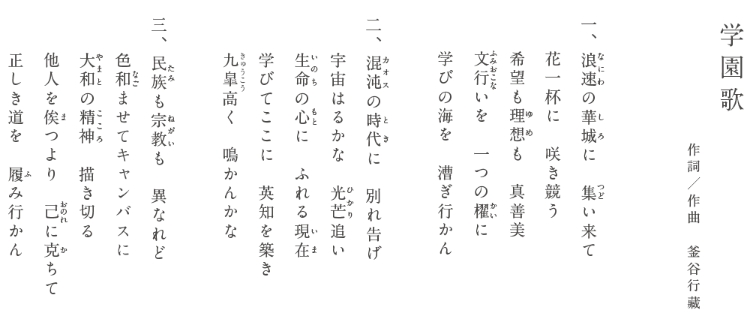 勉学に全力を尽くし、人類の文化を継承発展させ、国家社会に貢献すること。